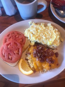 Breakfast favourites – Cracker Barrel obviously, Denny’s and IHOP. Cracker Barrel is still our absolute favourite, Egg Sandwich, which is scrambled egg (with cheese if you like) on sourdough toast with one piece of toast having a slither or mayo and a delicious succulent slice of a giant beefsteak tomato, with a side of hash-brown or hash-brown casserole, which is not like a UK hash-brown, but more spoonful of shredded hash brown cooked on a skillet. The casserole version is cooked in bacon grease (so sadly not suitable for vegetarians) but is delicious. Our other go to favourite, pecan pancake stack, which get served with butter and the cutest little bottles of Cracker Barrel maple syrup, warmed up! How absolutely delightful. Denny’s and IHOP also do some amazing breakfasts – pancakes and bacon and the most amazing sizzling skillets of veggies and breakfast potatoes and meats. Breakfast is probably our very favourite meal whilst on holiday. Oh heavens we didn’t even mention the Golden Corral yet – wouldn’t even have enough blog space or time to get us started on Golden Corral – so much choice it will blow your mind.