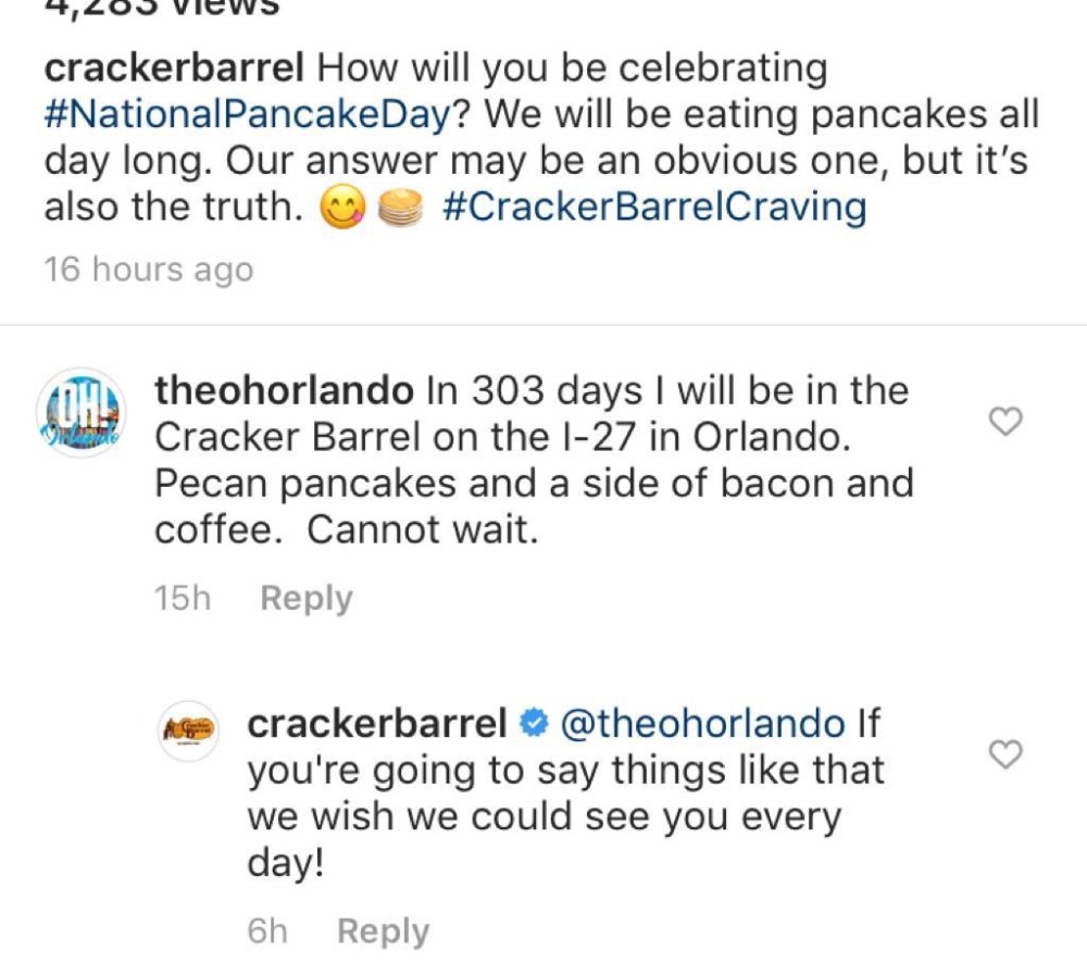 One of our absolute fave restaurants for breakfast is the Cracker Barrel, a chain of restaurants that serve good old fashioned home cooking with all the fixings. (Google it, we had to…) Their social media account is brilliant, it’s main focus is the staff and the food. Now we mention this not just because the food is superb …. no, really it is! and we’ve converted many people to it! But it’s really the staff and ambience/décor that make the chain. They are next level and we love the fact that the restaurant’s social media account shows them off. Kudos to the Cracker Barrel! We love that the same staff are there year after year, it says something about a company.