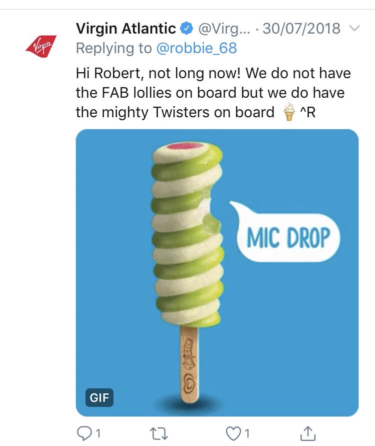 What we love about conversations on social media is the near instant reply you get. When we were going to Orlando last year we messaged Virgin Atlantic and asked if they still did the Rocket lolly’s on board? We got a brilliant reply in the form of a meme ‘sorry, Rocket lolly’s no longer served…all hail the mighty Twister lolly’ and then a ‘mic drop’ gif. Really made us laugh…and look forward to our flight and our Twister lolly!! Yum! (For those who have never travelled with Virgin Atlantic, after you’ve had lunch then dim the lights for your nap or for you to watch a film then the trolly with the ice lolly’s comes out! Happy days indeed!)