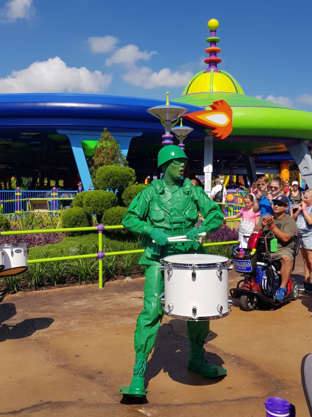 The theming does not stop there, as you would expect, the whole land is a riot of colour, for example when you walk around by the Alien Swirling Saucers the planting is full on dark greens and purples with the occasional 15 foot long ray gun for good measure. The Alien Swirling Saucer ride is a fun little ride for the younger members of the family, you sit in a little flying saucer towed behind the mothership piloted by the Aliens from the grabber machine in the Toy Story film. This ride flicks you from side to side whilst being spun around, not one for before the churros.