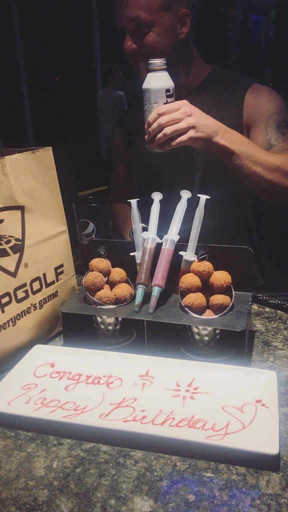 Our host was brilliant, he was asking if we were having fun and taking orders via his little iPad, and as if by magic the drinks would appear! The extra special touch was when the host asked why we were at Top Golf and Orlando, and we told him it was for Ash’s birthday and for our wedding a few days later. He arranged a lovely surprise of a free dessert of deep fried mini doughnut balls with a little rack of syringe’s filled with cream, custard, jam and chocolate to inject into the mini doughnut. Now there’s fun!