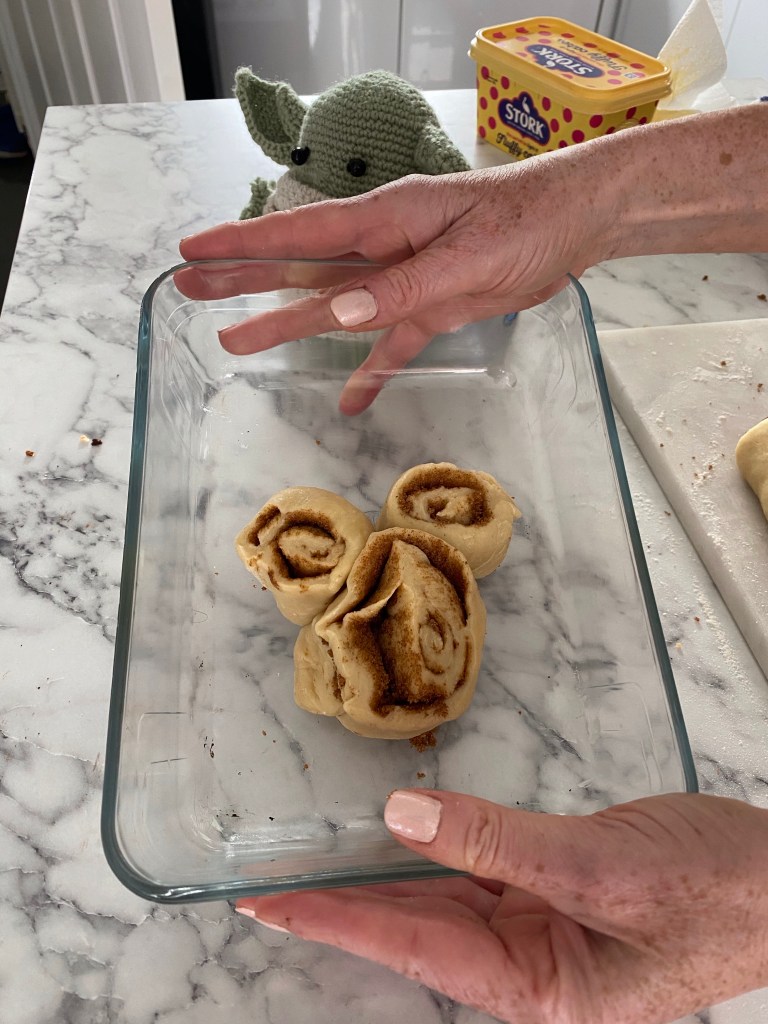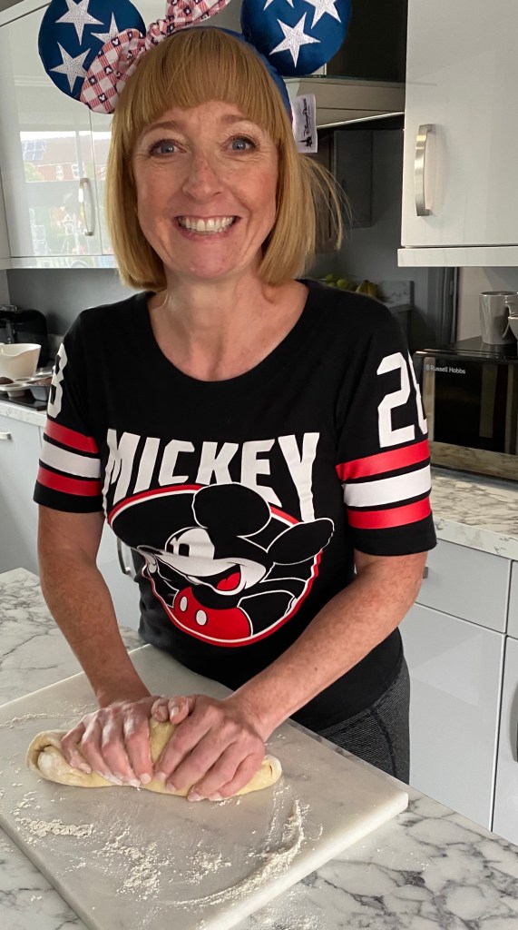 I made a batch of normal little cinnamon rolls (our waistlines are starting to expand a little too much during lockdown so didn’t want to make too many giant versions) and then had a little go at making a Mickey shaped one too. We didn’t make it as giant as the Kusafiri Coffee Shop one – see expanding waistline reference above – but it was Mickey shaped nonetheless. They proved quite nicely and almost doubled in size and then we popped them in the oven. The smell of the cinnamon and sweet bread baking wafted through the whole house. You’ll see from the photos that I got better at making the rolls and learned to roll them tighter with each batch we made.