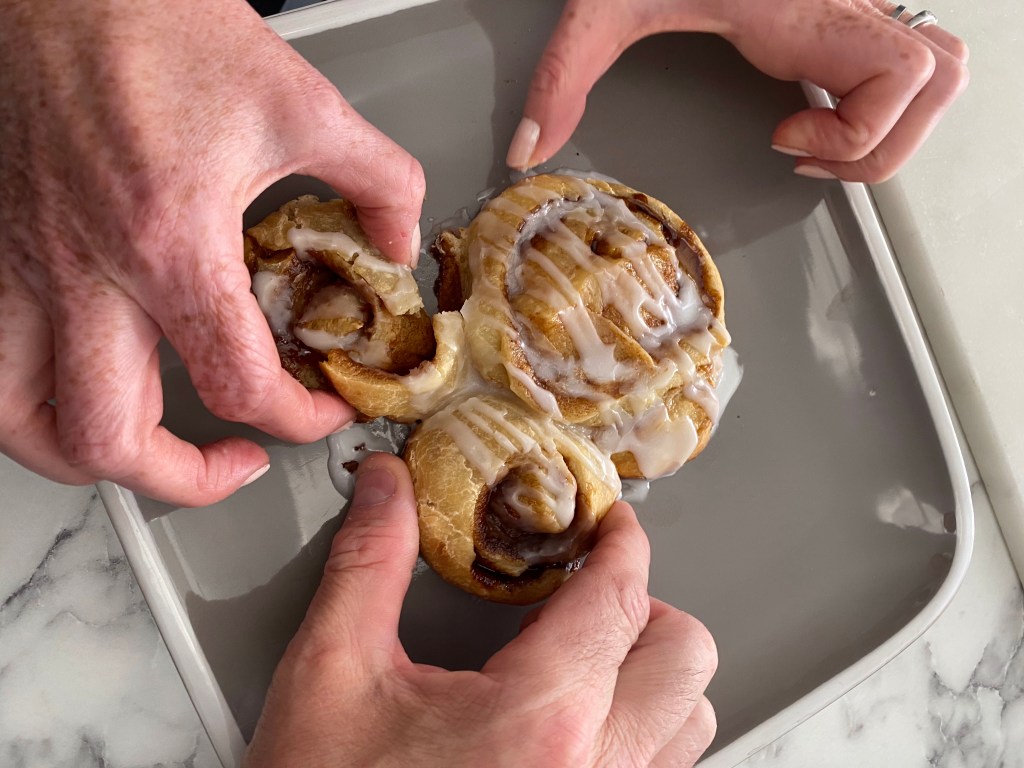 Warm cinnamon rolls just out of the oven and ready for the fun bit – drizzling the baked rolls with delicious white icing. Rob got involved with that bit too as you can imagine. And there we have it – tadaaaaaa! Sticky warm cinnamon rolls.