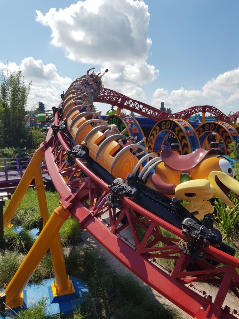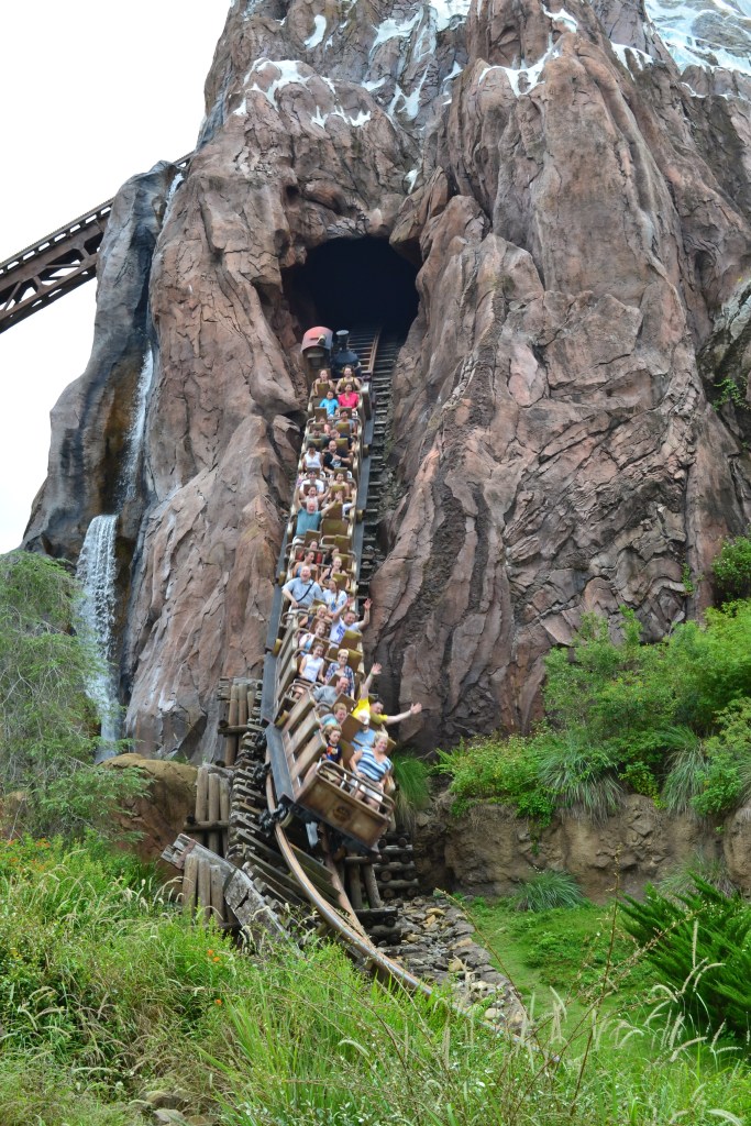 Another ride in Magic Kingdom is the Big Thunder Mountain Railroad. A cracking ride that is not the ‘full on’ coaster but a great introduction to them. It has some really good detailing all through it. It’s based on an abandoned mine/canyon and the way it’s been been made is nothing but astonishing. Each “rock” has been hand sculpted (if you have Disney+ watch the Imagineering Story, they show you how they did this in Disneyland Paris). The car is an old mine car with a old fashioned lap bar, this is an indication that it’s not too fast. The ride has some decent climbs and turns they are quick but not too quick as to scare anyone really. The thing I like most is the noise the train makes as it clacks and clanks up the hills. It’s got a really old fashioned feel and sound to it. One of the best little features are the decreasing radius turns, these get sharper the more you turn into them. All in all its a great introduction to the coaster world. And what about the Slinky Dog family friendly coaster at Hollywood Studios – ONE OF THE BEST MOST FUN FAMILY FRIENDLY COASTERS EVER! That is all – nothing further to say on this subject! And Everest over in Animal Kingdom is an amazingly themed absolutely fantastic coaster with a fabulous back story, an amazing and interesting queue and has thrills and spills galore – another one of our faves!