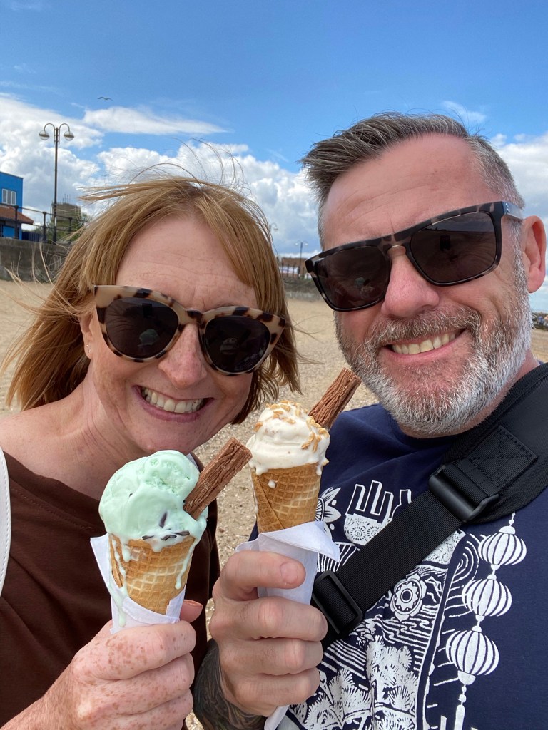 Monday morning found us much like it would in Orlando, sitting outside in the morning sunshine drinking a cup of tea quietly and enjoying the view. No hot air balloons or smell of the orange groves, and possibly not quite so warm, but it was sunny and pleasant and the garden was alive with bees and butterflies and the smell of roses and sweet peas. Breakfast done, we headed off to a Waterside Nature Reserve that we found online. It’s at Barton Upon Humber, and as it turns out it was lovely. Nice and quiet so easy to socially distance, fantastic views of the Humber Bridge, peace and quiet, ducks to feed, some lovely scenery and a brilliant visitor centre that was perfectly set up to provide toilet facilities and a cafe all safely and nicely done. So a nice walk was followed by a little cup of tea/coffee and a big chunk of cake! Why not, we’re on holiday after all. A lovely morning by anyone’s standards. Next we headed along the coast to Cleethorpes. It was a lovely day and consequently a little busier than we would have liked, but we managed to keep away from folk and stay outside, and we had a good wander along the promenade. We had hoped to see the sea, but sadly it was so far out that you could barely see it on the horizon. We found a great outside garden cafe for lunch and then headed back to the prom for an ice-cream. Rob was delighted with his Biscoff cone covered in nuts and with a flake. I opted for a mint-choc chip and we walked along the sand eating them. We saw a little children’s fun fair area and there was a rickety green very tiny roller-coaster type thing. We were nearly hysterical with laughter as Rob filmed it and said “it’s not exactly Slinky Dog is it?”